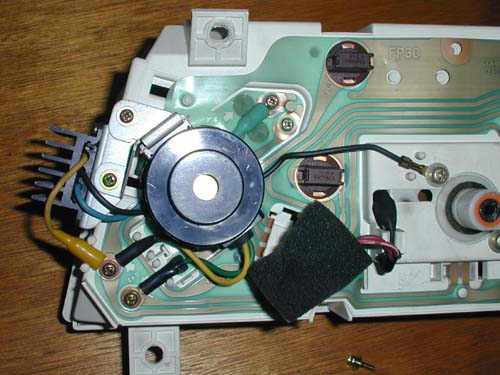 メーターパネルの裏側から見て左側にある円形のブザーを固定しているビス2本と緑色と黄色の端子を固定しているビスを外して端子を取り外せば良い。